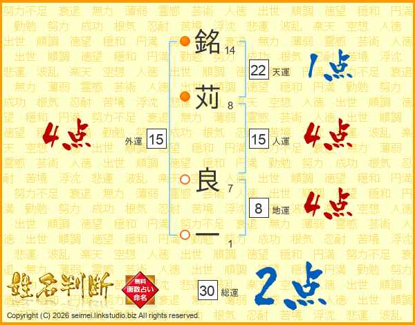 生活面を象徴する運勢です。外部から受ける影響力を表し、結婚運、家庭運や職場、環境への順応性を表します。総運から人運を引いた画数。姓や名が1文字の場合を除く。