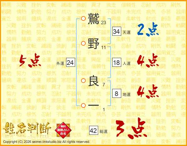 生活面を象徴する運勢です。外部から受ける影響力を表し、結婚運、家庭運や職場、環境への順応性を表します。総運から人運を引いた画数。姓や名が1文字の場合を除く。