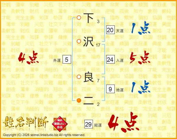生活面を象徴する運勢です。外部から受ける影響力を表し、結婚運、家庭運や職場、環境への順応性を表します。総運から人運を引いた画数。姓や名が1文字の場合を除く。