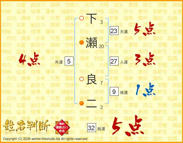生活面を象徴する運勢です。外部から受ける影響力を表し、結婚運、家庭運や職場、環境への順応性を表します。総運から人運を引いた画数。姓や名が1文字の場合を除く。