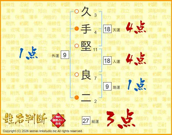 久(3画)手(4画)堅(11画) 良(7画)二(2画)