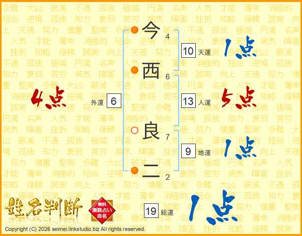 生活面を象徴する運勢です。外部から受ける影響力を表し、結婚運、家庭運や職場、環境への順応性を表します。総運から人運を引いた画数。姓や名が1文字の場合を除く。