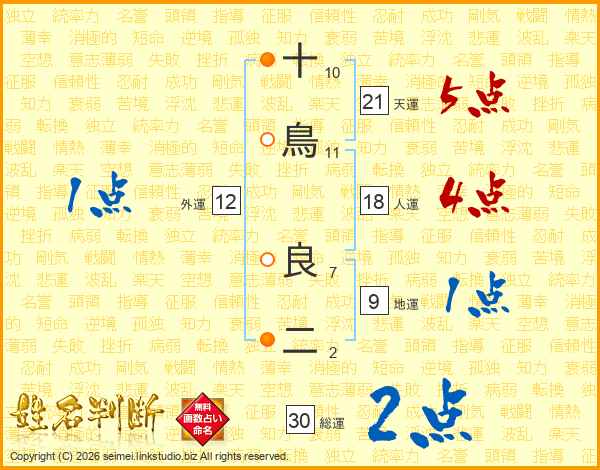 生活面を象徴する運勢です。外部から受ける影響力を表し、結婚運、家庭運や職場、環境への順応性を表します。総運から人運を引いた画数。姓や名が1文字の場合を除く。