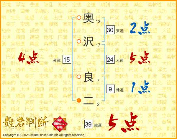 奥沢良二さんの総運は39画の5点!