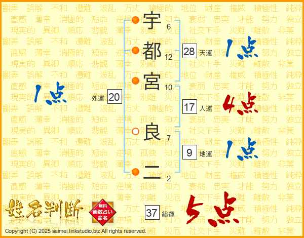 宇(6画)都(12画)宮(10画) 良(7画)二(2画)