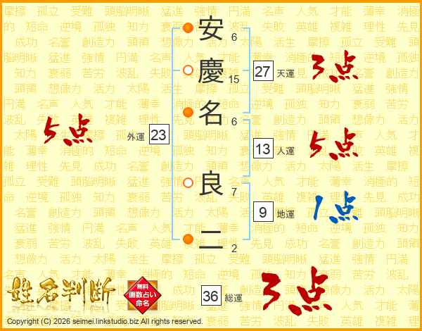 安(6画)慶(15画)名(6画) 良(7画)二(2画)