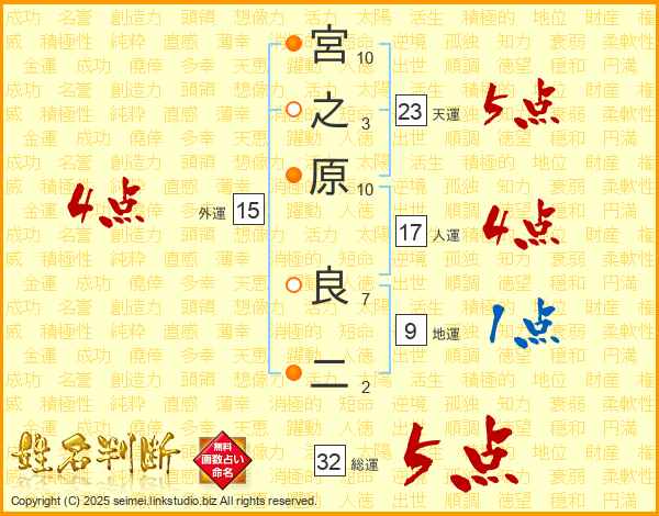 宮(10画)之(3画)原(10画) 良(7画)二(2画)