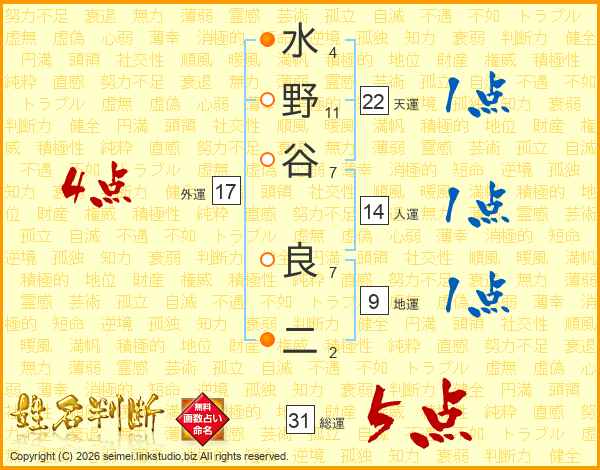 水(4画)野(11画)谷(7画) 良(7画)二(2画)