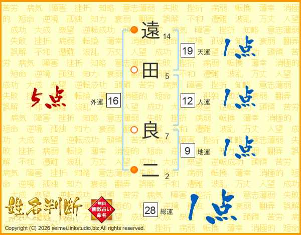 生活面を象徴する運勢です。外部から受ける影響力を表し、結婚運、家庭運や職場、環境への順応性を表します。総運から人運を引いた画数。姓や名が1文字の場合を除く。