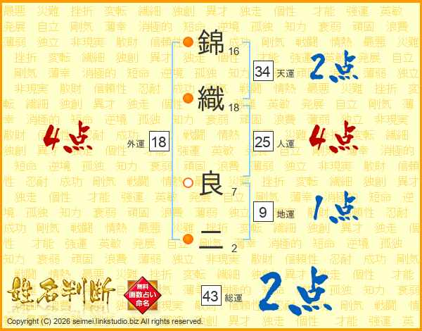 錦(16画)織(18画) 良(7画)二(2画)