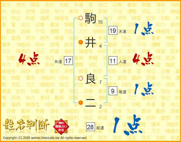 駒(15画)井(4画) 良(7画)二(2画)