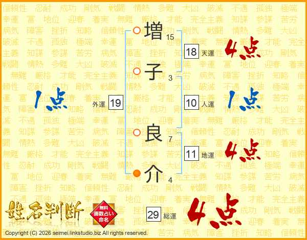 増(15画)子(3画) 良(7画)介(4画)