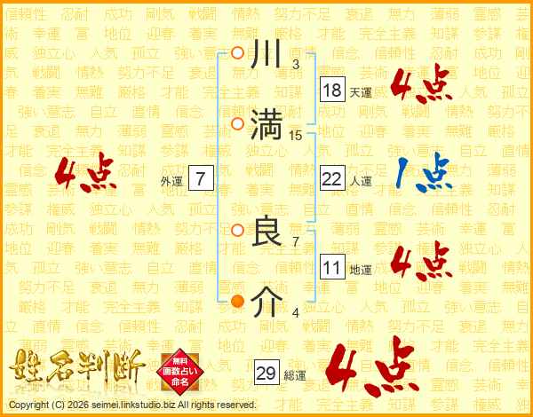 川(3画)満(15画) 良(7画)介(4画)