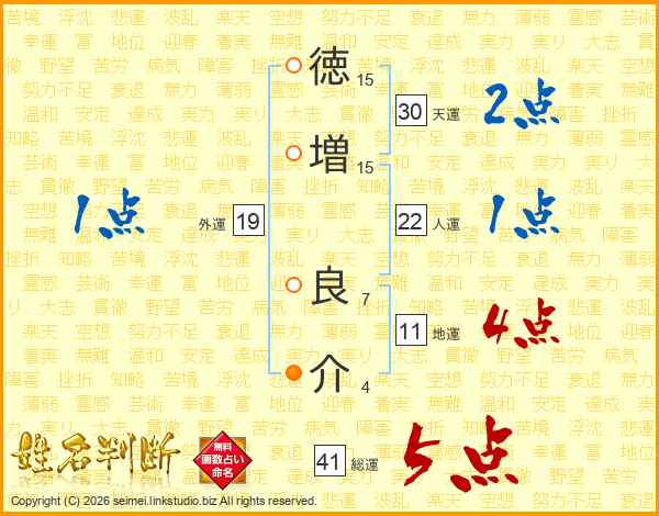 徳(15画)増(15画) 良(7画)介(4画)