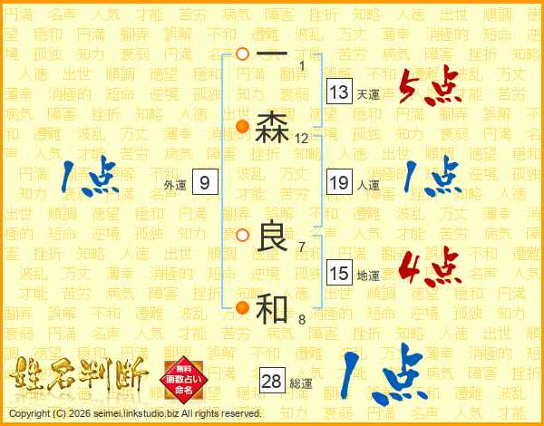 一(1画)森(12画) 良(7画)和(8画)
