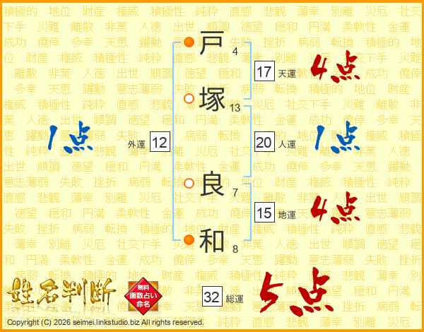 戸(4画)塚(13画) 良(7画)和(8画)