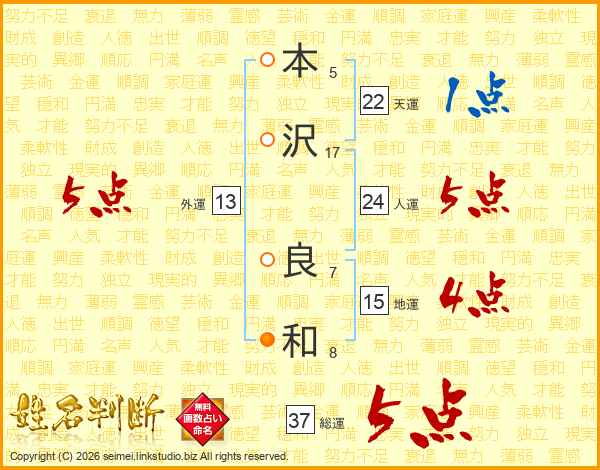 本沢良和さんの総運は37画の5点!
