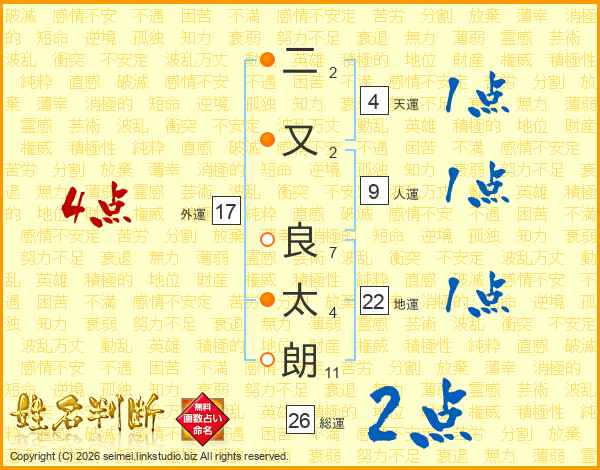 二(2画)又(2画) 良(7画)太(4画)朗(11画)