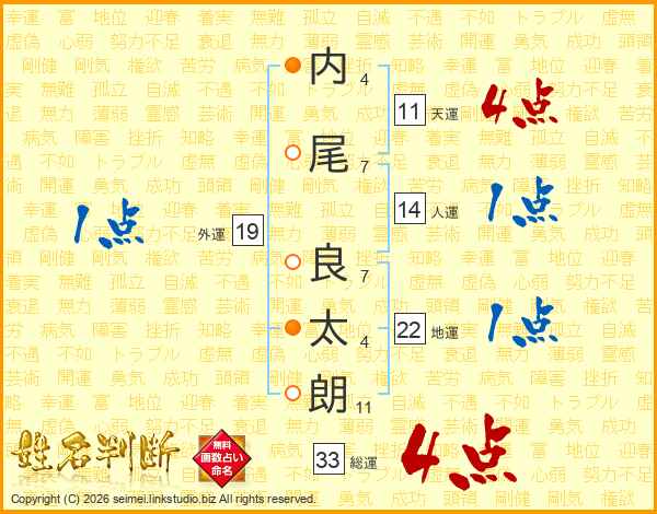 内(4画)尾(7画) 良(7画)太(4画)朗(11画)