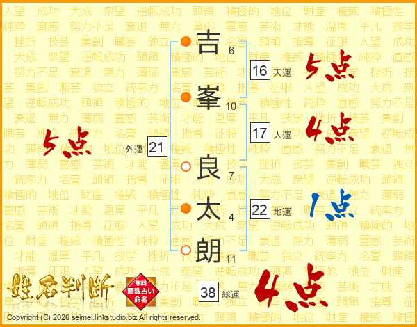 吉(6画)峯(10画) 良(7画)太(4画)朗(11画)