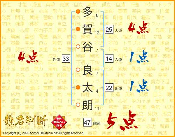 多(6画)賀(12画)谷(7画) 良(7画)太(4画)朗(11画)
