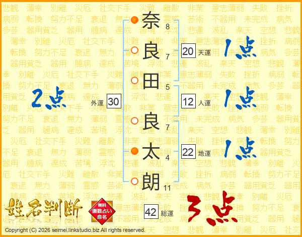 奈(8画)良(7画)田(5画) 良(7画)太(4画)朗(11画)