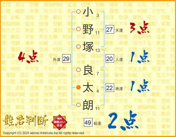 小(3画)野(11画)塚(13画) 良(7画)太(4画)朗(11画)
