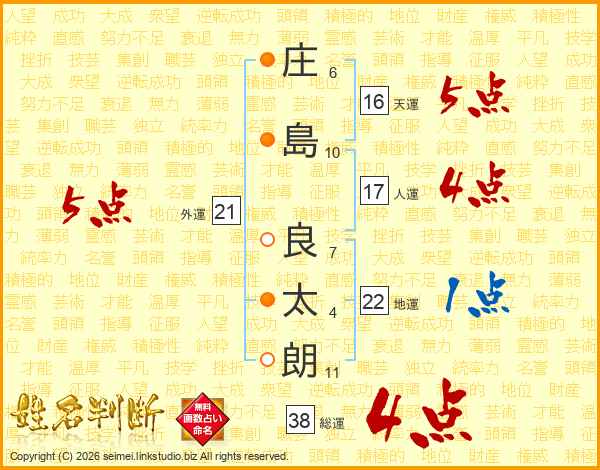 庄(6画)島(10画) 良(7画)太(4画)朗(11画)