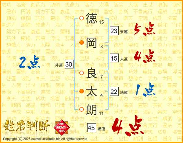 徳(15画)岡(8画) 良(7画)太(4画)朗(11画)