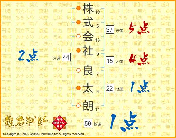 株(10画)式(6画)会(13画)社(8画) 良(7画)太(4画)朗(11画)