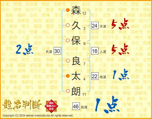 森(12画)久(3画)保(9画) 良(7画)太(4画)朗(11画)