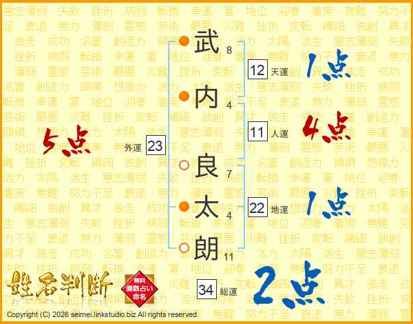 武(8画)内(4画) 良(7画)太(4画)朗(11画)