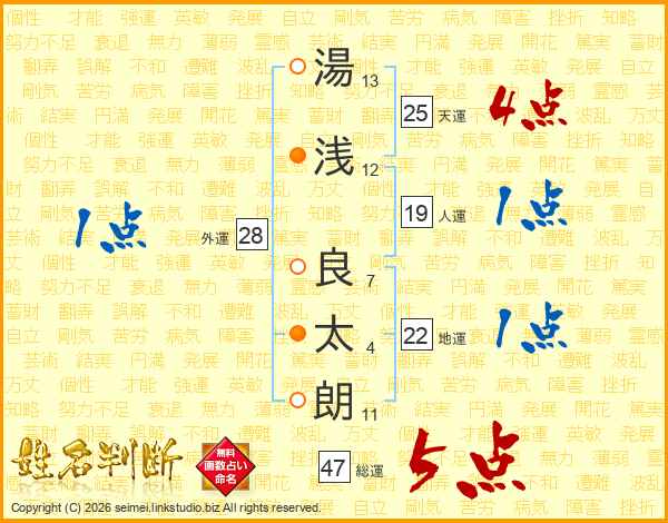 湯(13画)浅(12画) 良(7画)太(4画)朗(11画)