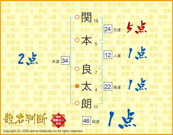 関(19画)本(5画) 良(7画)太(4画)朗(11画)
