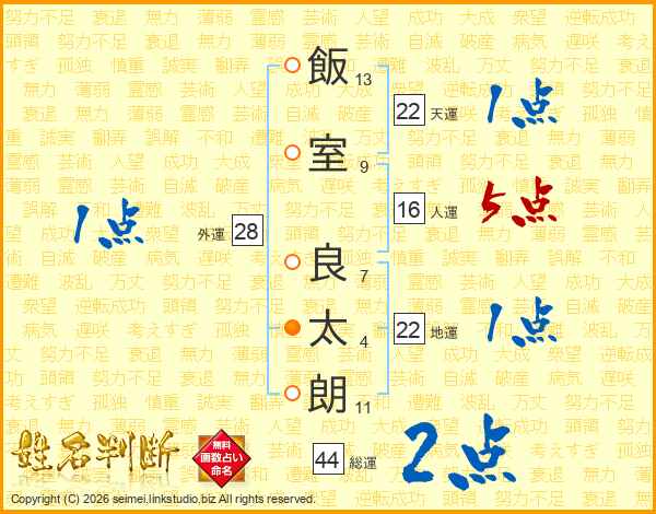 飯(13画)室(9画) 良(7画)太(4画)朗(11画)