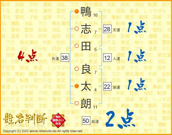 鴨(16画)志(7画)田(5画) 良(7画)太(4画)朗(11画)