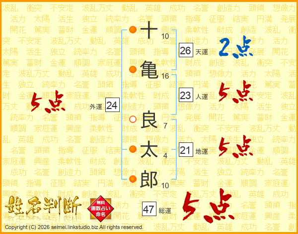 十(10画)亀(16画) 良(7画)太(4画)郎(10画)