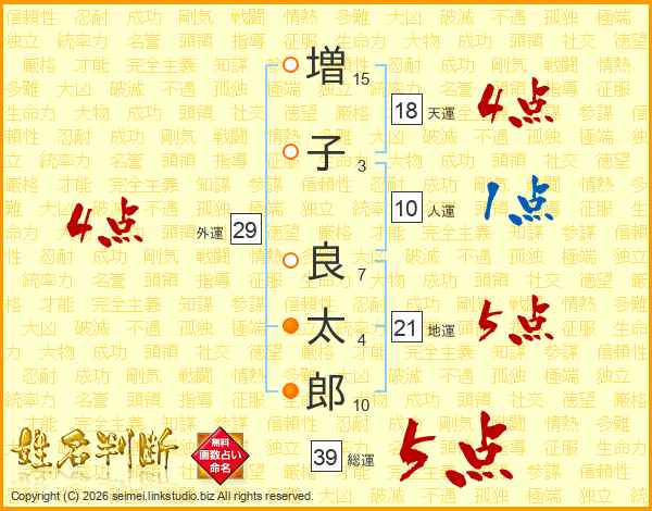 増(15画)子(3画) 良(7画)太(4画)郎(10画)