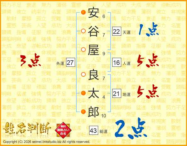 安(6画)谷(7画)屋(9画) 良(7画)太(4画)郎(10画)