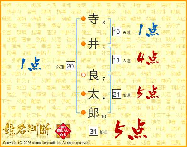 寺(6画)井(4画) 良(7画)太(4画)郎(10画)