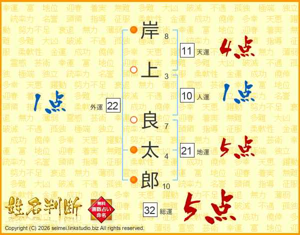岸(8画)上(3画) 良(7画)太(4画)郎(10画)