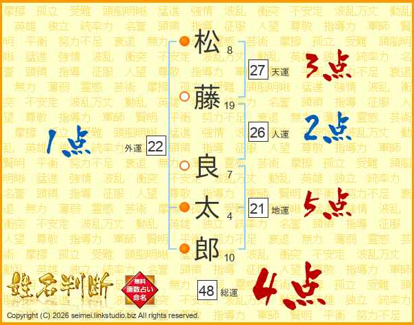 松(8画)藤(19画) 良(7画)太(4画)郎(10画)