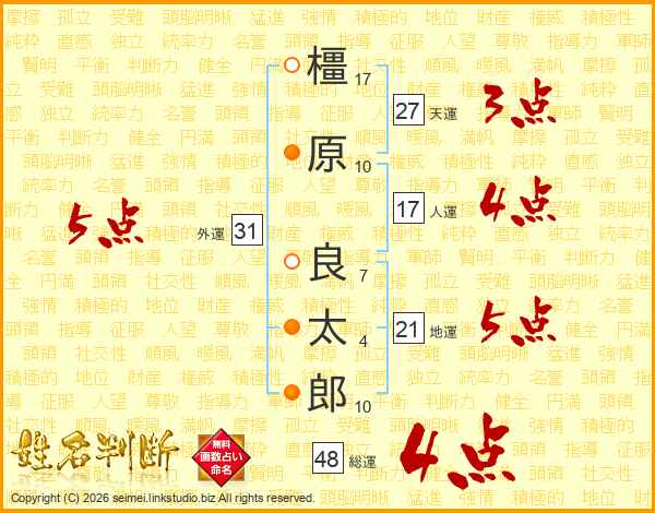 橿(17画)原(10画) 良(7画)太(4画)郎(10画)
