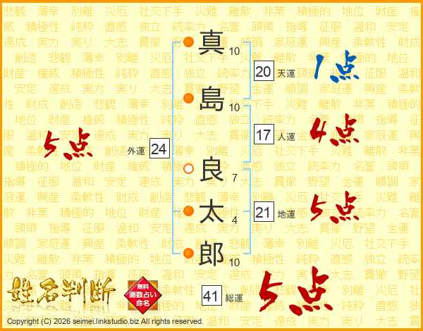 真(10画)島(10画) 良(7画)太(4画)郎(10画)