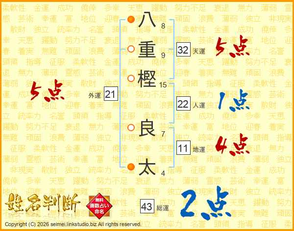 八(8画)重(9画)樫(15画) 良(7画)太(4画)