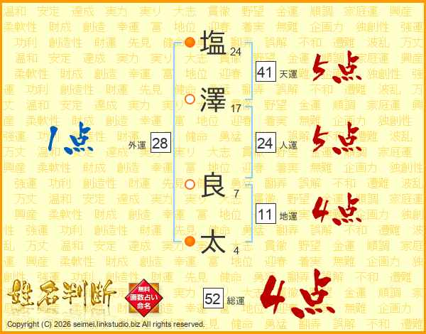 塩(24画)澤(17画) 良(7画)太(4画)