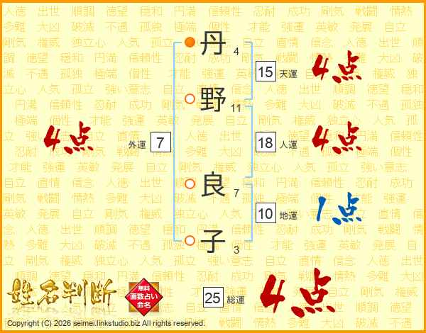 丹(4画)野(11画) 良(7画)子(3画)