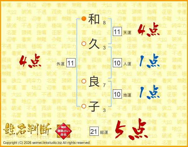 生活面を象徴する運勢です。外部から受ける影響力を表し、結婚運、家庭運や職場、環境への順応性を表します。総運から人運を引いた画数。姓や名が1文字の場合を除く。