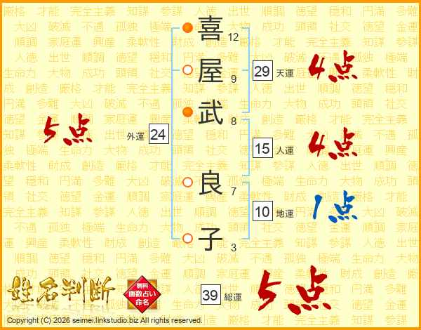 喜(12画)屋(9画)武(8画) 良(7画)子(3画)