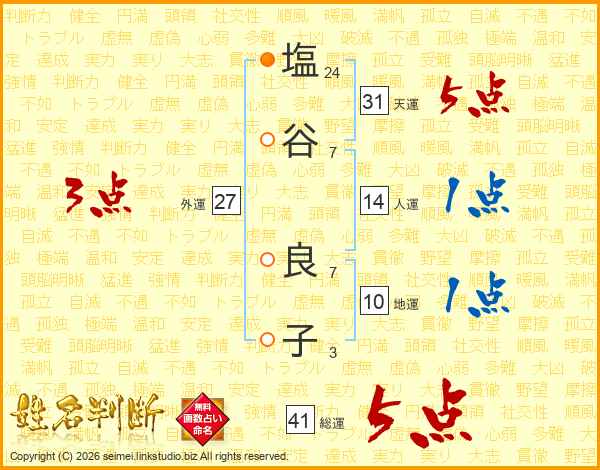 塩(24画)谷(7画) 良(7画)子(3画)